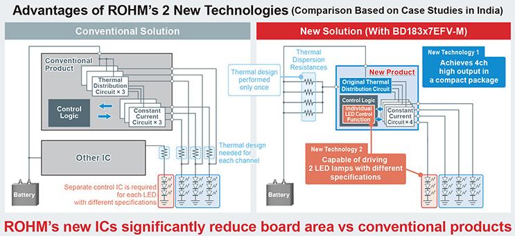 Unlike existing systems which require 2 ICs to drive LED lamps with different specifications (i.e. rear and license plate lamps), ROHM's new ICs integrate an individual LED control function that can simultaneously drive 2 different types of LEDs, minimizing board area by consolidating the number of ICs from 2 to 1.